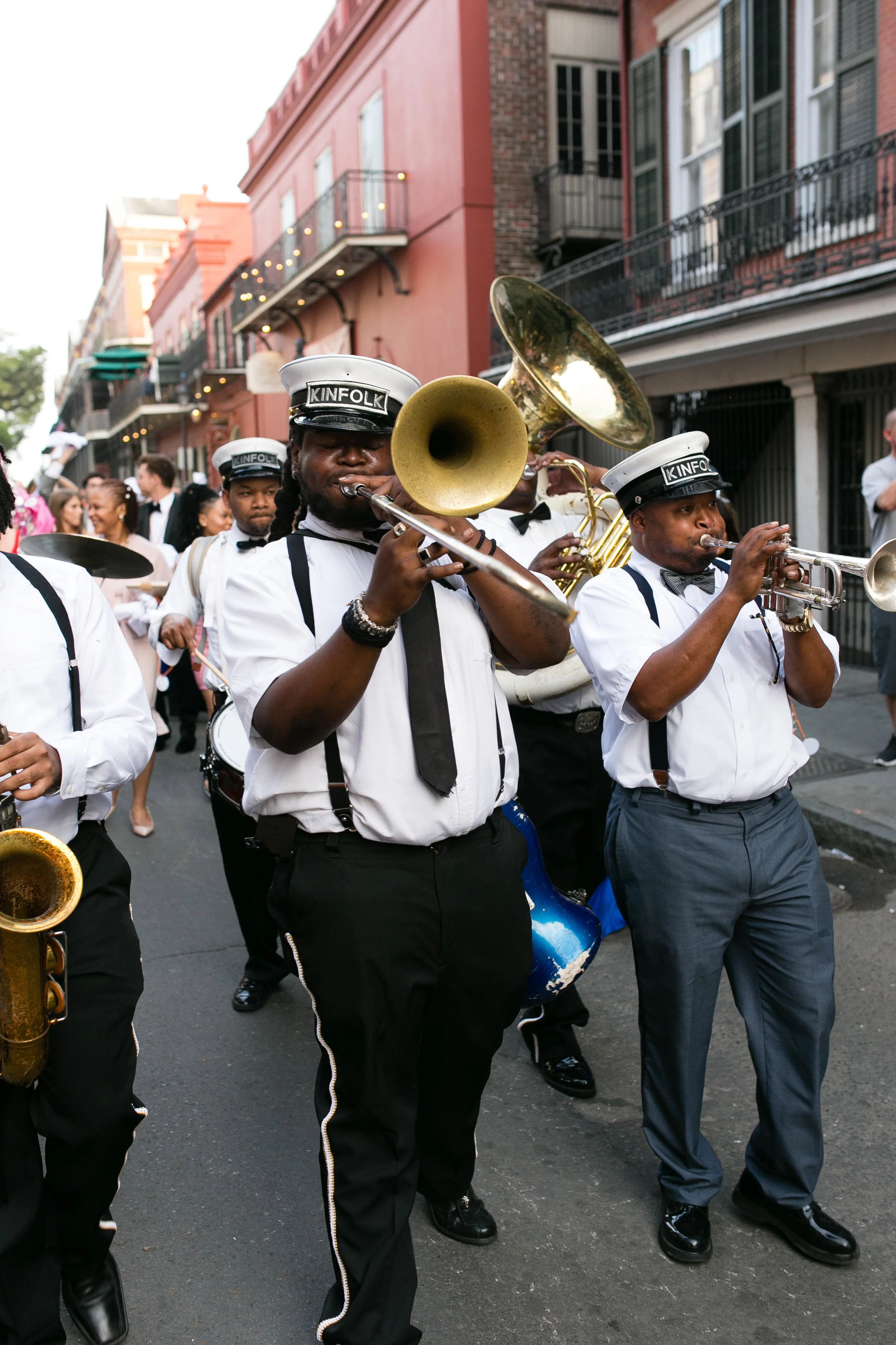 Vendors & Contributors: Photographer: @emiliajane_ · Planning & Design: @bluegardeniaevents · Floral: @beesweddings · Ceremony Venue: @lastatemuseum · Reception Venue: @theroosevelt_no · Wedding Dress: @justinalexander · Hair: @alimvasquez · Invitations: @gourmetinvites · Makeup: @lynnavo · Linens: @nuagedesignsinc · Invitations: @gourmetinvites · Second Line: @kinfolkbrassband2019 · Band: Brass: @brassaholics